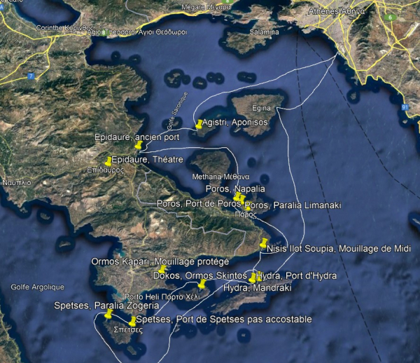 Une pléiade d'iles entourée d'eaux limpides permet d'envisager une splendide navigation d'environ 180Mn entre Agistri, Epidaure, Poros, Hydra, Dokos, Spetses et Egine. Le programme de navigation reste bien entendu totalement ouvert aux suggestions de l'équipage.